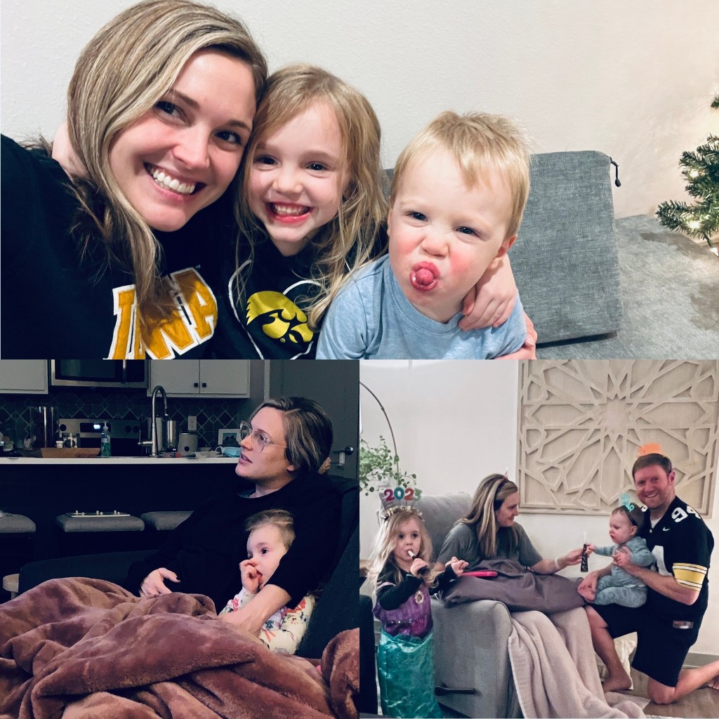 Bottom Right: NYE ringing in 2023 (Had been home for 1 day after hysterectomy – still in so much pain and hardly moving yet from that recliner)